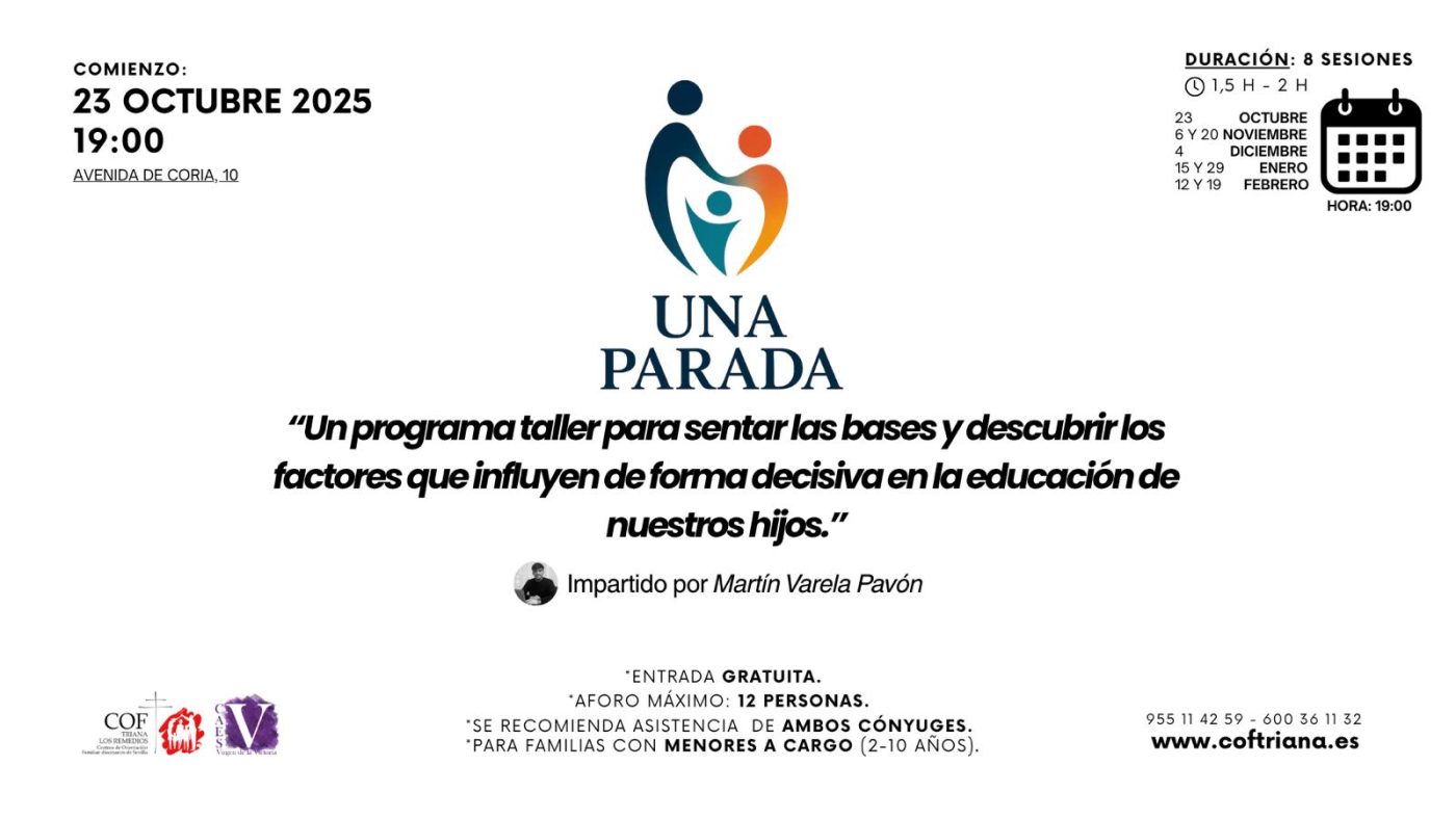 Al comienzo del curso 25-26 ofrecemos un taller sobre educación de los hijos entre 2 y 10 años. Objetivos: Sentar las bases y descubrir los factores que influyen de forma decisiva en la educación de nuestros hijos (“Crianza Efectiva”) “Una Parada” surge con la misión de crear un espacio único de encuentro y aprendizaje para …